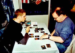 Die Ungeduld der Wartenden wurde immer deutlicher spürbar, je weiter sie im Album der Phase V blätterten. Dennoch mussten wir immer wieder erklären, dass es die Phase V noch nicht gäbe und dass es noch etwa 4 – 6 Wochen dauern würde, bis man sie kaufen könne – und dass sie zum Con in Dreieich am 22. und 23.11.2003 wahrscheinlich verfügbar sein wird, während derzeit nur die Spielphasen I – IV bei uns und im Handel erhältlich sind.
