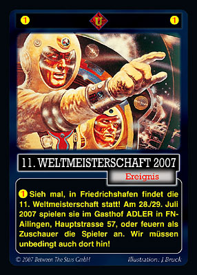 denn er würde sofort seine Robotschiffe in Marsch setzen, um die Erde zu vernichten. Um das PERRY RHODAN-Sammelkartenspiel spielen zu können ist kein Hintergrundwissen über die PERRY RHODAN-Serie erforderlich. Alle für das Spiel relevanten Informationen sind in die Karten eingearbeitet! Komm also auch du zur 11. Weltmeisterschaft und spiele zwei Tage lang die Handlung der ersten beiden Zyklen der PERRY RHODAN-Serie nach. Unterstütze Perry Rhodan mit deinen genialen Taktiken und Strategien - und du wirst gewaltige Raumkämpfe, draufgängerische Missionen, aber auch angriffslustige Aliens, knifflige galaktische Rätsel und wagemutige Agenteneinsätze erleben. Neben vielen Preisen gibt es für alle Mitspieler auch eine Promokarte (die Roboterbombe oder die Nottransition) und natürlich Weltranglistenpunkte. Oder komm einfach als Zuschauer, um das Spiel kennen zu lernen, die Spieler bei ihren Aktionen anzufeuern und viele Infos zum Spiel zu erhalten. An beiden Tagen werden auch wieder Einführungsrunden in die Phase I des Spiels angeboten, Einführungsdecks stehen dafür zur Verfügung.