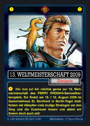 Die Weltmeisterschaft 2009 findet in Berlin statt. Komm nach Berlin und spiele zwei Tage lang die Handlung der ersten beiden Zyklen der PERRY RHODAN-Serie nach. Gründe die Dritte Macht und verteidige dein Terra gegen die Individualverformer und die Fantan-Leute. Fliege ins Wega-System, erobere das Fernraumschiff STARDUST II von den Topsidern und löse die galaktischen Rätsel des Geistwesen ES, um Wanderer, die Welt der Unsterblichkeit, zu finden. Wehre dich auf Snowman gegen die Springer und die Überschweren und finde Harno, die Kugel aus Zeit und Raum, im Tatlira-System. Pass aber auf, dass nicht der Overhead mit seinen Mutanten auf deinem Terra die Oberhand gewinnt, während du in der Milchstraße unterwegs bist. Fliege nach Aralon, um die Galaktischen Mediziner in ihre Schranken zu weisen. Und schütze die Erde vor dem Robotregenten von Arkon, indem du ihm die Vernichtung Terras vorgaukelst. Sende Agenten aus, um Informationen über die militärische Lage in der heimatlichen Galaxis zu erhalten. Sei aber vorsichtig, denn Talamon kennt dich und deine Mutanten! Hilf Atlan, seine Unterseekuppel zu verlassen und nach Hellgate zu kommen und überzeuge ihn, die Terraner bei ihren Aktionen zu unterstützen. Auf Terra planen inzwischen die Aufrechten Demokraten und die Naturphilosophen ein Attentat auf Perry Rhodan. Dieses musst du rechtzeitig entdecken und vereiteln. Verbanne die Attentäter mit der Adventurous nach Gray Beast, damit sie dort die erste terranische Kolonie außerhalb des solaren Sonnensystems aufbauen können. Wenn da nur nicht die Peepsies auf dem Nachbarplaneten wären...