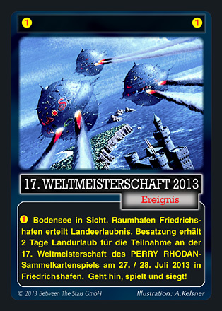 Die Weltmeisterschaft 2013 findet in Friedrichshafen am Bodensee statt. Komm nach Friedrichshafen und spiele zwei Tage lang die Handlung der ersten beiden Zyklen der PERRY RHODAN-Serie nach. Gründe die Dritte Macht und verteidige dein Terra gegen Individualverformer, Saboteure und Fantan-Leute. Fliege anschließend ins Wega-System, hilf dort den Ferronen bei ihrem Kampf gegen die Topsider und erobere von ihnen das Fernraumschiff STARDUST II. Löse die galaktischen Rätsel des Geistwesen ES, um Wanderer, die Welt der Unsterblichkeit, zu finden. Wehre dich auf Snowman gegen die Springer und die Überschweren und verhindere, dass Etztak dort eine Arkonbombe zündet. Finde im Tatlira-System Harno, die Kugel aus Zeit und Raum und befreie die Welt von den Springern. Als Preis erhältst du dort die GANYMED, den modernsten Schlachtkreuzer der Springer. Pass gleichzeitig aber auf, dass nicht der Overhead mit seinen Mutanten auf deinem Terra die Oberhand gewinnt, während du in den Tiefen der Milchstraße unterwegs bist. Fliege mit der GANYMED nach M-13, um Kontakt mit den Arkoniden aufzunehmen und die Galaktischen Mediziner auf Aralon in ihre Schranken zu weisen. Und schütze die Erde vor dem Robotregenten von Arkon, indem du ihm falsche Koordinaten der Erde zuspielst und die Vernichtung Terras vorgaukelst. Sende 56 Jahre später Agenten aus, um Informationen über die militärische Lage in der heimatlichen Milchstraße zu erhalten. Sei aber vorsichtig, denn Talamon kennt dich und deine Mutanten! Hilf Atlan, seine Unterseekuppel zu verlassen und nach Hellgate zu kommen und überzeuge ihn, die Terraner bei ihren Aktionen zu unterstützen. Auf Terra planen inzwischen die Aufrechten Demokraten und die Naturphilosophen ein Attentat auf Perry Rhodan. Dieses musst du rechtzeitig entdecken und vereiteln. Verbanne die Attentäter mit der Adventurous nach Gray Beast, damit sie dort die erste terranische Kolonie außerhalb des Solaren Sonnensystems aufbauen können. Wenn da nur nicht die Peepsies auf dem Nachbarplaneten wären...