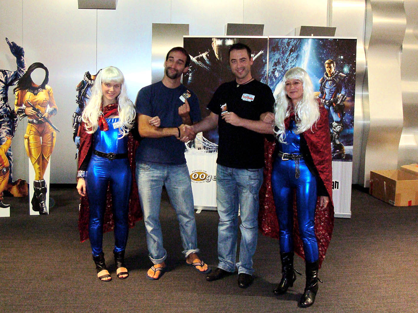 Moritz, der Sieger der Quartett-Weltmeisterschaft (2. v. l.) und Marc vom Pabel-Moewig-Verlag mit den beiden Arkonidinnen Zara da Zoltral (l.) und Thora da Zoltral (r.) von Between The Stars. |
