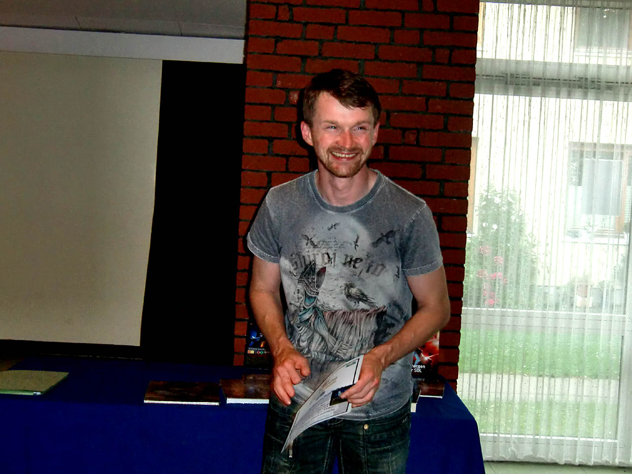 Ansgar, der Weltmeister 2014, betrachtet als erster die neue Promokarte. |
