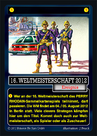 Die Weltmeisterschaft 2012 findet in Berlin statt. Komm nach Berlin und spiele zwei Tage lang die Handlung der ersten beiden Zyklen der PERRY RHODAN-Serie nach. Gründe die Dritte Macht und verteidige dein Terra gegen Individualverformer, Saboteure und Fantan-Leute. Fliege ins Wega-System, hilf dort den Ferronen bei ihrem Kampf gegen die Topsider und erobere von ihnen das Fernraumschiff STARDUST II. Löse anschließend die galaktischen Rätsel des Geistwesen ES, um Wanderer, die Welt der Unsterblichkeit, zu finden. Wehre dich auf Snowman gegen die Springer und die Überschweren und verhindere, dass Etztak dort eine Arkonbombe zündet. Finde im Tatlira-System Harno, die Kugel aus Zeit und Raum und befreie die Welt von den Springern. Pass gleichzeitig aber auf, dass nicht der Overhead mit seinen Mutanten auf deinem Terra die Oberhand gewinnt, während du in den Tiefen der Milchstraße unterwegs bist. Fliege nach M-13, um Kontakt mit den Arkoniden aufzunehmen und die Galaktischen Mediziner auf Aralon in ihre Schranken zu weisen. Und schütze die Erde vor dem Robotregenten von Arkon, indem du ihm falsche Koordinaten der Erde zuspielst und die Vernichtung Terras vorgaukelst. Sende 56 Jahre später Agenten aus, um Informationen über die militärische Lage in der heimatlichen Milchstraße zu erhalten. Sei aber vorsichtig, denn Talamon kennt dich und deine Mutanten! Hilf Atlan, seine Unterseekuppel zu verlassen und nach Hellgate zu kommen und überzeuge ihn, die Terraner bei ihren Aktionen zu unterstützen. Auf Terra planen inzwischen die Aufrechten Demokraten und die Naturphilosophen ein Attentat auf Perry Rhodan. Dieses musst du rechtzeitig entdecken und vereiteln. Verbanne die Attentäter mit der Adventurous nach Gray Beast, damit sie dort die erste terranische Kolonie außerhalb des solaren Sonnensystems aufbauen können. Wenn da nur nicht die Peepsies auf dem Nachbarplaneten wären...
