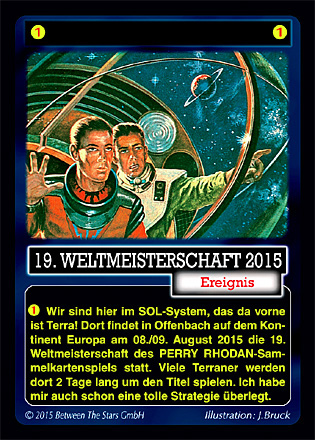 Auf der 19. Weltmeisterschaft werden die Phasen I - V gespielt. Wer nicht durchgehend spielen möchte, kann auch Spielerunden auslassen oder später einsteigen. Wer die Endrunde am Sonntag nicht mitspielen kann/will, wird beim Endergebnis nach seinen Punkten in den Vorrunden hinten angereiht. Jeder Turnierteilnehmer erhält die exklusive WM-Promokarte. Teilnehmen kann jeder, Zuschauer sind jederzeit willkommen, der Eintritt ist frei. Um das PERRY RHODAN-Sammelkartenspiel spielen zu können ist kein Hintergrundwissen über die PERRY RHODAN-Serie erforderlich. Sämtliche für das Spiel relevanten Informationen sind in die Karten eingearbeitet. Ein Spieler, der PERRY RHODAN überhaupt nicht kennt, kann das Spiel also genauso gut spielen wie jemand, der sämtliche Romane gelesen hat. Oder komm einfach nur als Zuschauer, um das Spiel kennen zu lernen, die Spieler bei ihren Aktionen anzufeuern und viele Infos zum Spiel zu erhalten. An beiden Tagen werden auch wieder für Neueinsteiger Einführungsrunden in die Phase I des Spiels angeboten, Einführungsdecks stehen dafür zur Verfügung. |